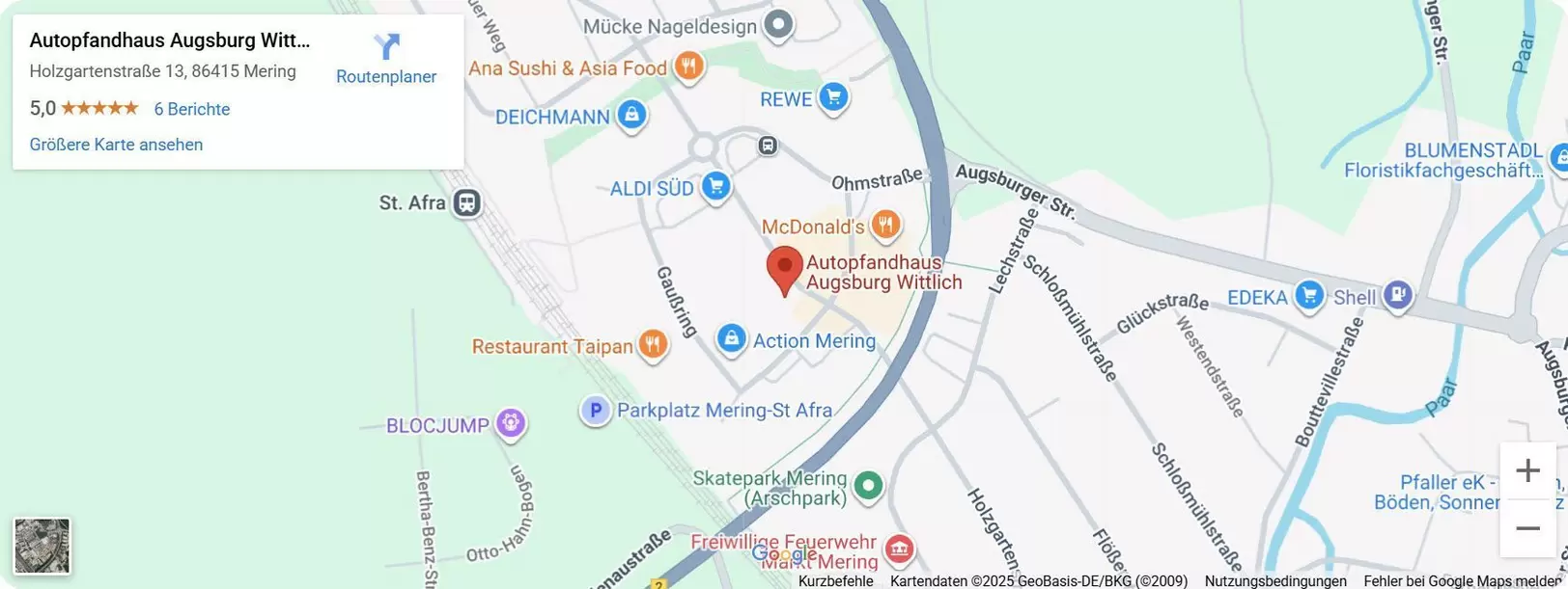 Unser Kfz-Pfandkredithaus in Augsburg ist zentral gelegen und gut erreichbar – ideal für Kunden aus allen Stadtteilen. Wir bieten schnelle, diskrete und faire Lösungen, wenn kurzfristig finanzielle Mittel benötigt werden. Unsere Leistungen stehen Ihnen in folgenden Augsburger Stadtgebieten zur Verfügung: Innenstadt, Lechhausen, Göggingen, Pfersee und Hochzoll.