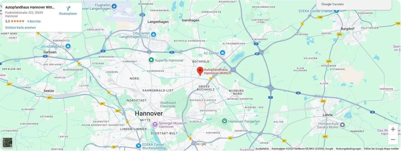Unser Standort in Hannover ist zentral gelegen und einfach zu erreichen. Wir sind ca. 5 km von der A2 entfernt. Die Beleihung Ihres Pkw an unserem Standort in Hannover ist unkompliziert und bei Vorlage aller nötigen Unterlagen können Sie Ihr Bargeld schnell erhalten. Klären Sie deshalb alle Fragen am besten per E-Mail oder telefonisch im Vorfeld mit uns ab. Gerne unterbreiten wir Ihnen ein unverbindliches Angebot und helfen Ihnen dabei, Ihren finanziellen Engpass schnell zu überbrücken. Unser Vertrag ist sofort nach Aufsetzung zur Unterschrift bereit, sodass Sie sofort Bargeld ausgezahlt bekommen können.