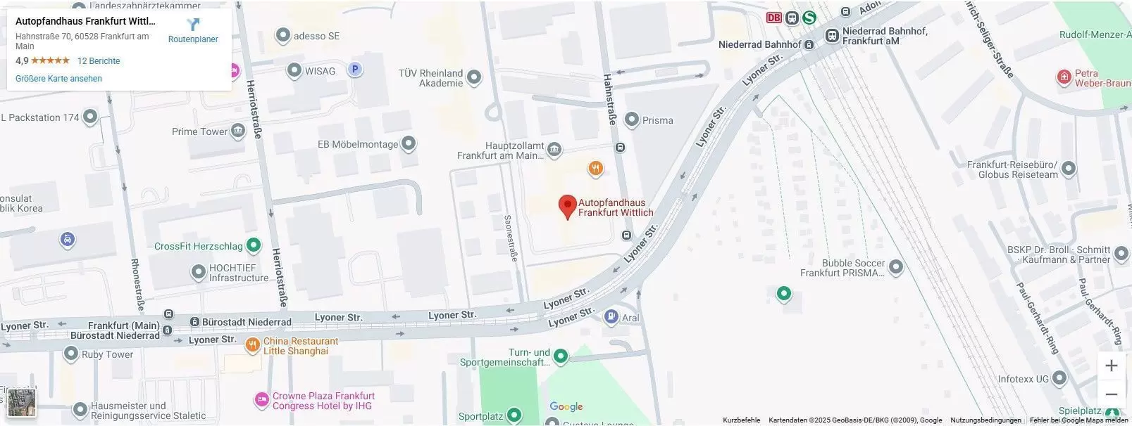 Unser Kfz-Pfandkredithaus in Frankfurt ist zentral gelegen und gut erreichbar – ideal für Kunden aus allen Stadtteilen. Wir bieten schnelle, diskrete und faire Lösungen, wenn kurzfristig finanzielle Mittel benötigt werden. Unsere Leistungen stehen Ihnen in folgenden Frankfurter Stadtgebieten zur Verfügung: Sachsenhausen, Bockenheim, Nordend, Bornheim & Höchst.