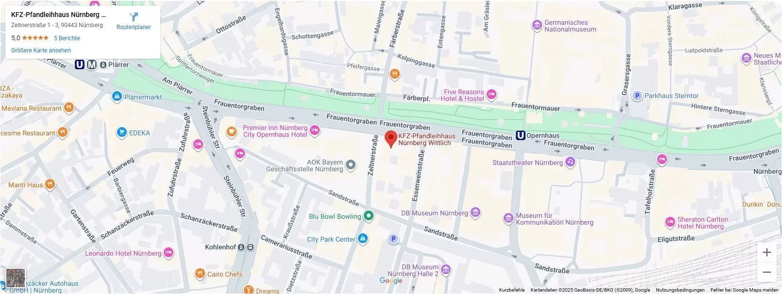Damit wir Ihr Fahrzeug prüfen können, bringen Sie es in unser Kfz-Leihhaus Nürnberg. Unser Standort befindet sich zentral gelegen in der Nähe vom Hauptbahnhof. Ist das Fahrzeug in Ordnung und das Darlehen vereinbart, erhalten Sie Ihre Auszahlung schon innerhalb einer Stunde. Haben Sie keine Zeit, selbst zu uns zu kommen, bieten wir als besondere Leistung für unsere Kunden einen bundesweiten Hol- und Bringservice zum Pfandhaus für Autos aller Art an.